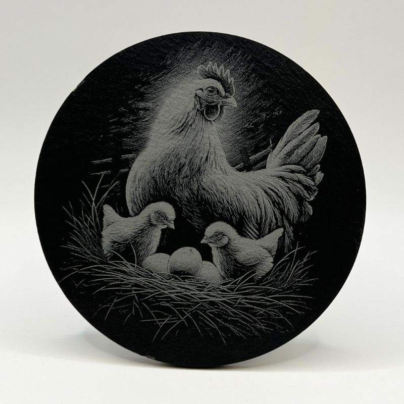 Eksklusive glassbrikker i ekte skifer med detaljert lasergravert høne, kyllinger og egg motiv. Et unikt og gårdsinspirert innslag til borddekkingen – både praktisk og dekorativ. Perfekt som gave eller til hytta.